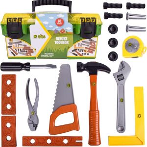 John Deere 18 Piece Deluxe Tool Box, Construction Playset with Tape Measure and Tools, Interactive Building Toys, Preschool Toys for Boys and Girl